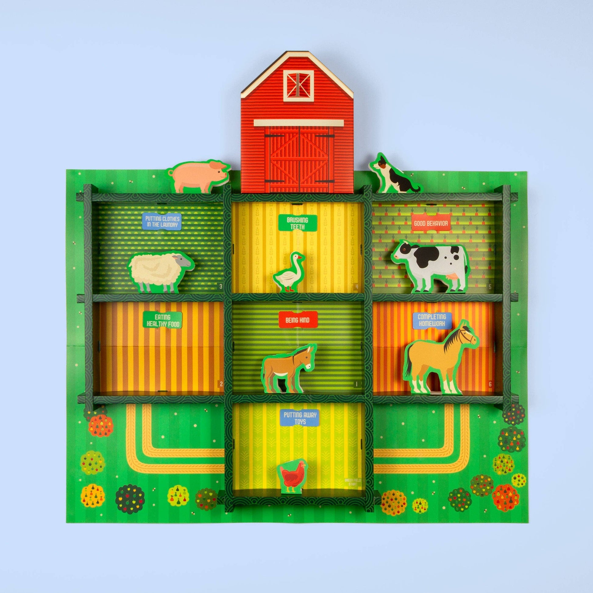 Have fun on the farm with this four in one activity kit! Use it as a beautiful piece of wall art, an educational reward chart, a fun farmyard activity playset, or use the dice provided to play fun and educational farmyard games. Take a trip to Piggott’s farm with a beautifully illustrated farmyard scene that will brighten up any room.