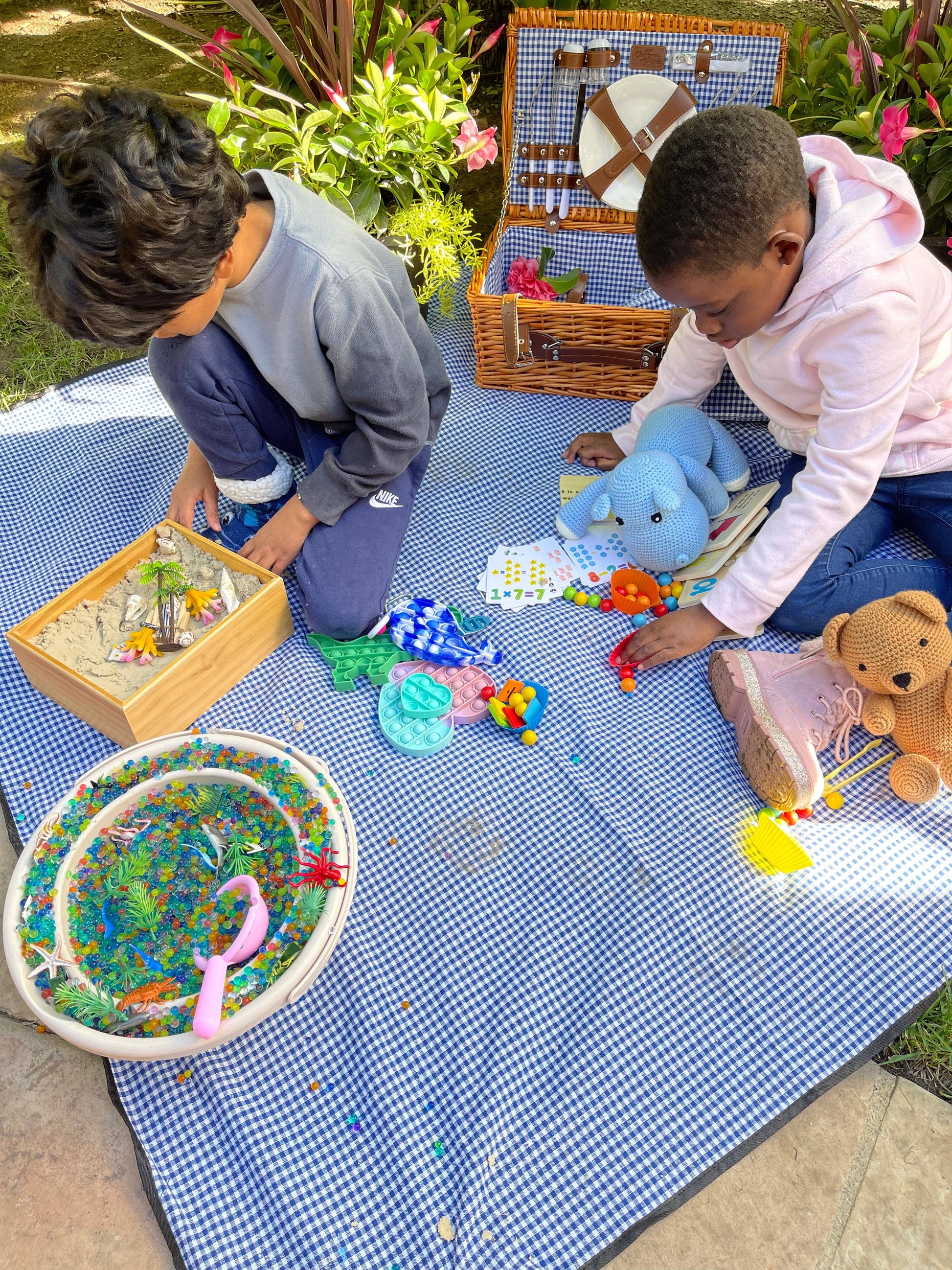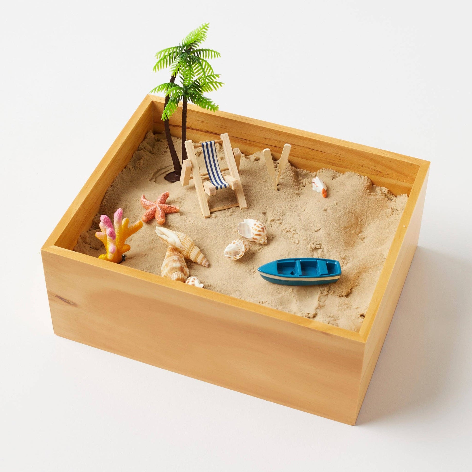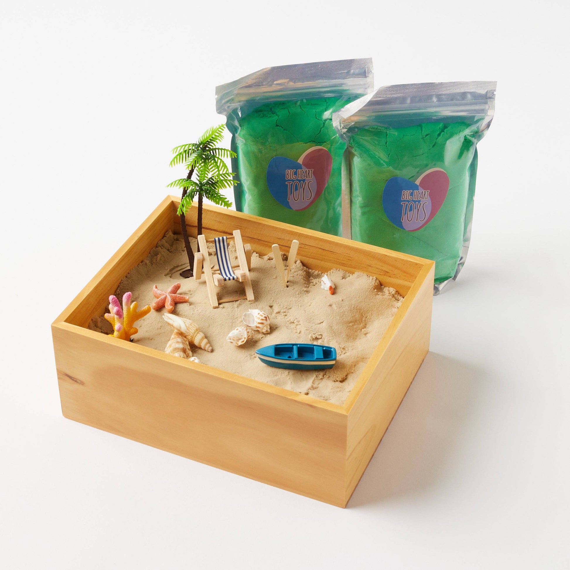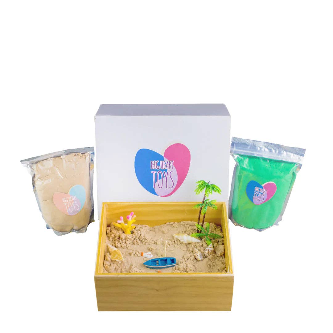 Kinetic sand is beneficial in supporting physical development, such as fine motor skills and provides a range of sensory experiences for children who struggle with texture. Social and emotional development can be supported by engaging with the kinetic sand as children may find it calming and relaxing. A sand bag, beach accessories and the sand box are included.