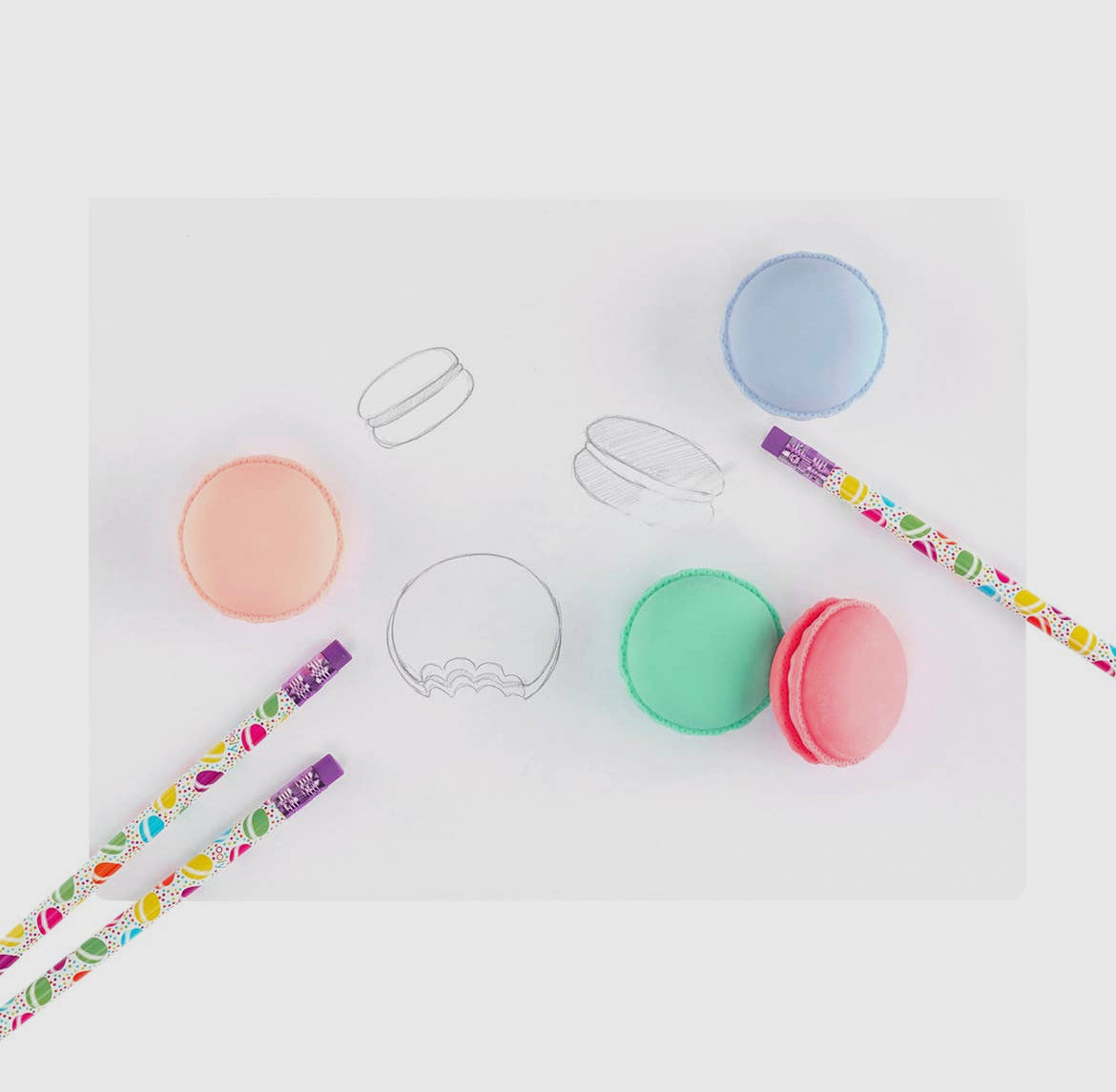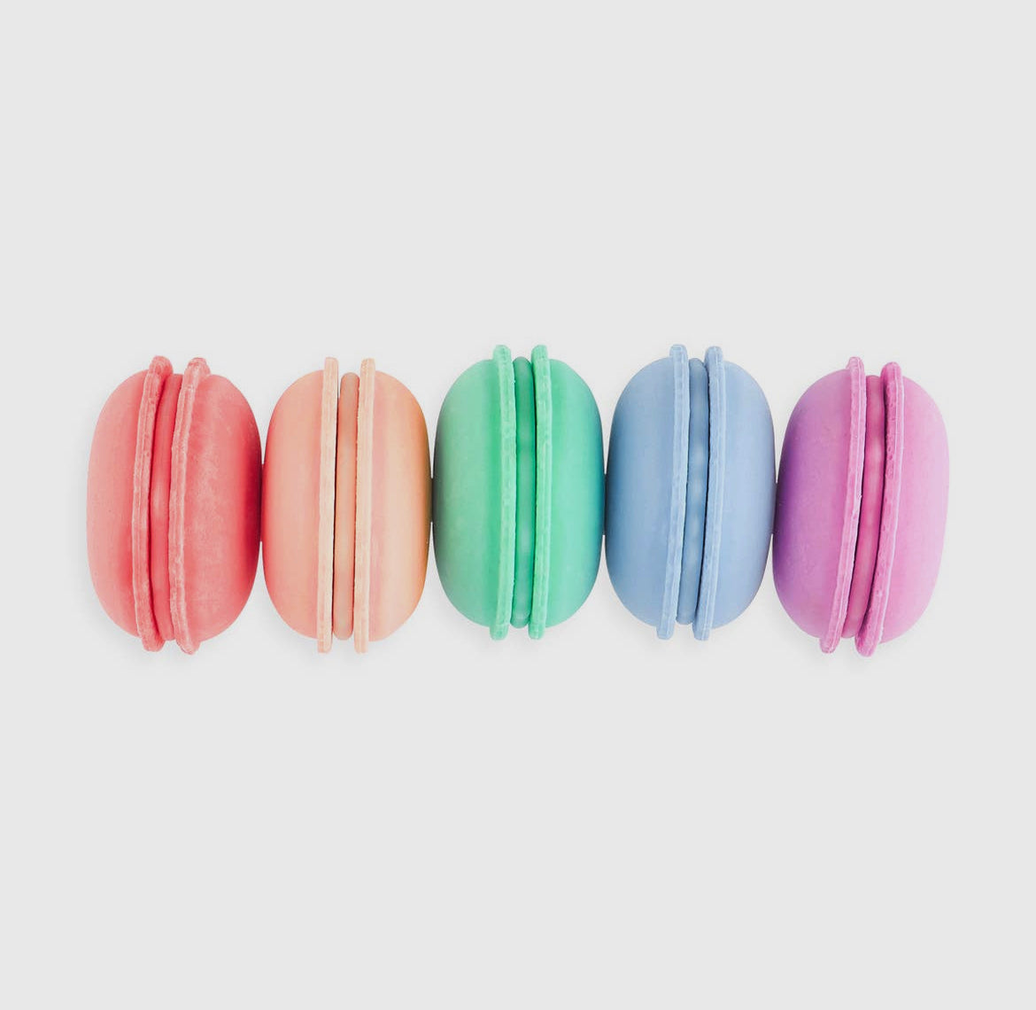 Erase pencil mistakes away in style. A delectable looking set of 5 pastry erasers; Le Macaron Pâitisserie scented erasers are a colorful set of macaron erasers with a fresh vanilla scent. These macaron erasers are also puzzle erasers too, which means you can mix and match them to make all sorts of multi-colored French pastry erasers.