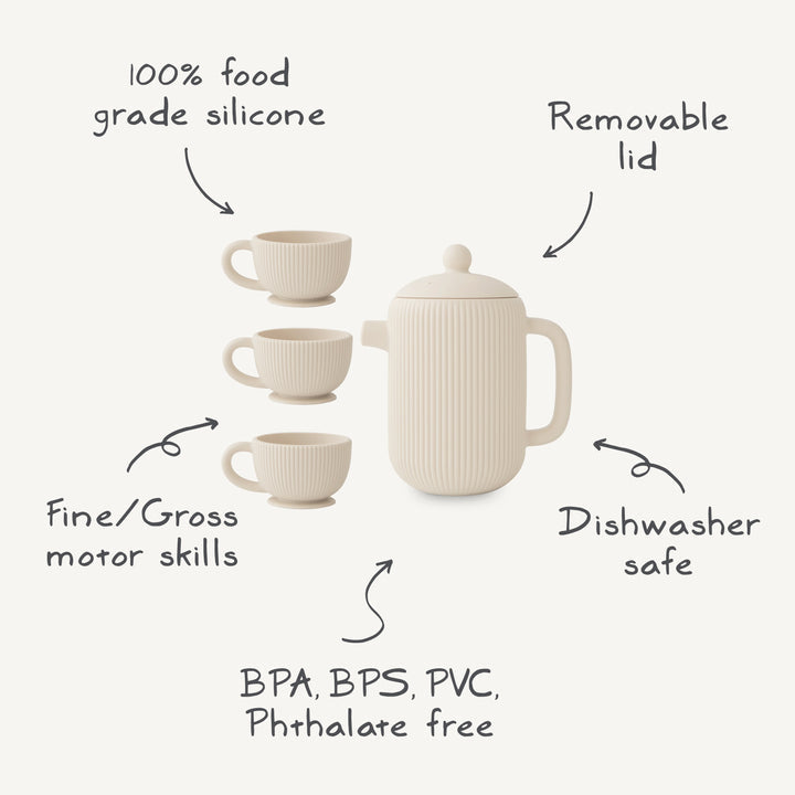Mushie's silicone tea play set is designed for little hands and big imaginations. This adorable set includes a teapot with removable lid and three matching tea cups, all made from 100% food-grade silicone. Soft and durable, our tea set is perfect for hours of pretend play and encourages communication and social skills. Dishwasher safe for easy clean up once tea time is over. Mushie's silicone tea set is a charming addition to play kitchens and bath time.
