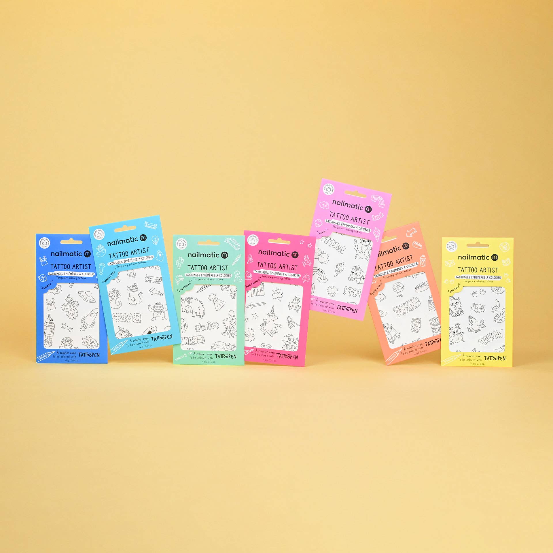 Apply a design to your skin, then use our temporary tattoo pens to color and draw around it. Repeat, erasing the colors with water and choosing others. To remove the tattoo, use oil make-up remover. To be applied with water, lasts 3 to 7 days, easy to remove. Designed and formulated for kids. Our eco friendly ink is suitable for sensitive skin, even on face. Dermatologically and ophthalmologically tested.